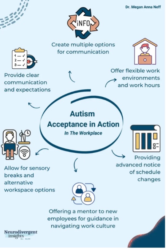 Neff, M., (2023, April 18). Autism In The Workplace: How To Be Autism-Affirming. Neurodivergent Insights. https://neurodivergentinsights.com/autism-in-the-workplace/?srsltid=AfmBOoq6pqikca-TEzpIuvT-sDmQPtlIN6K3w7qfduVP_YvNA9v8bkGZ